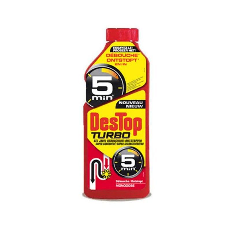 Le Destop Gel Turbo 500ml est un déboucheur puissant conçu pour éliminer rapidement les bouchons dans les canalisations. Idéal pour WC, éviers et lavabos.