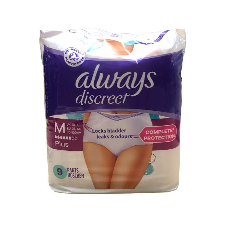 Le culotte Always Discreet M+ (36-44) offrono una protezione efficace e invisibile contro le perdite urinarie. Morbide, traspiranti e confortevoli, si indossano come un normale intimo, garantendo libertà di movimento e sicurezza tutto il giorno.