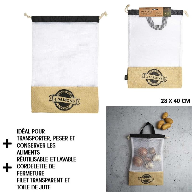 Ideaal voor groenten, fruit, granen, noten of andere droge producten. De zak is gemaakt van ademend, licht en stevig materiaal met een handig trekkoordje.