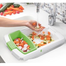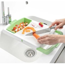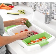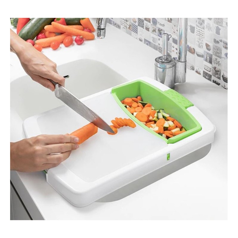 Une planche à découper extensible originale et polyvalente avec plateau amovible, égouttoir intégré et récipient amovible pour déposer les aliments ou les déchets. Cette planche à découper polyvalente et peu encombrante peut être utilisée dans plusieurs positions. Idéale pour éplucher, couper et laver les aliments très facilement, en évitant d'utiliser et de salir divers ustensiles. Elle s'adapte à l'évier et peut être facilement démontée pour la nettoyer et la ranger.